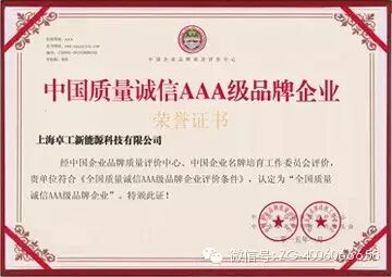 2015年1月,上海卓工新能源科技有限公司荣获《中国质量诚信AAA级品牌企业》荣誉称号