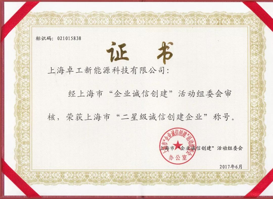 2017年6月,上海卓工新能源科技有限公司荣获上海市“二星级诚信创建企业”称号