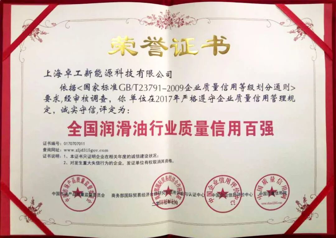 2017年,上海卓工新能源科技有限公司荣获“全国润滑油行业质量信用百强”称号