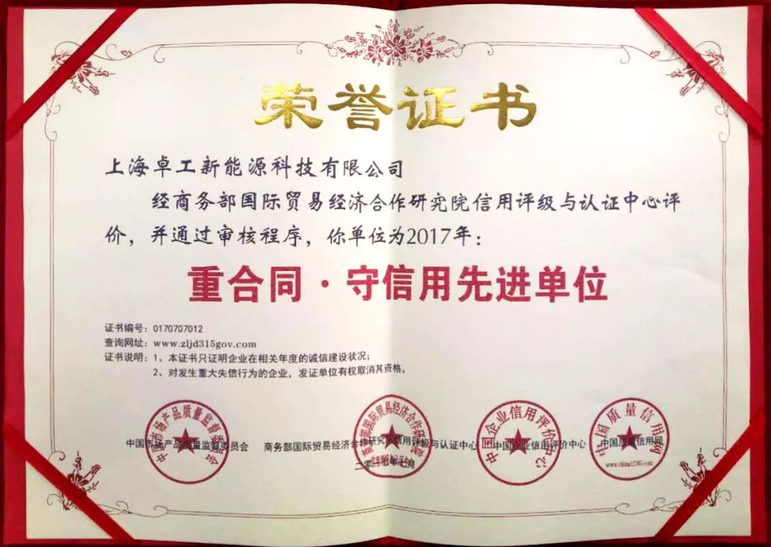 2017年,上海卓工新能源科技有限公司荣获“重合同·守信用先进单位”称号