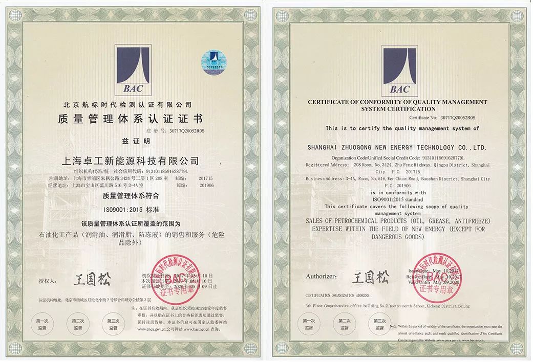 2014年3月上海卓工新能源科技有限公司通过ISO9001:2008标准 质量管理体系认证;2017年5月通过ISO9001:2015标准 质量管理体系认证。