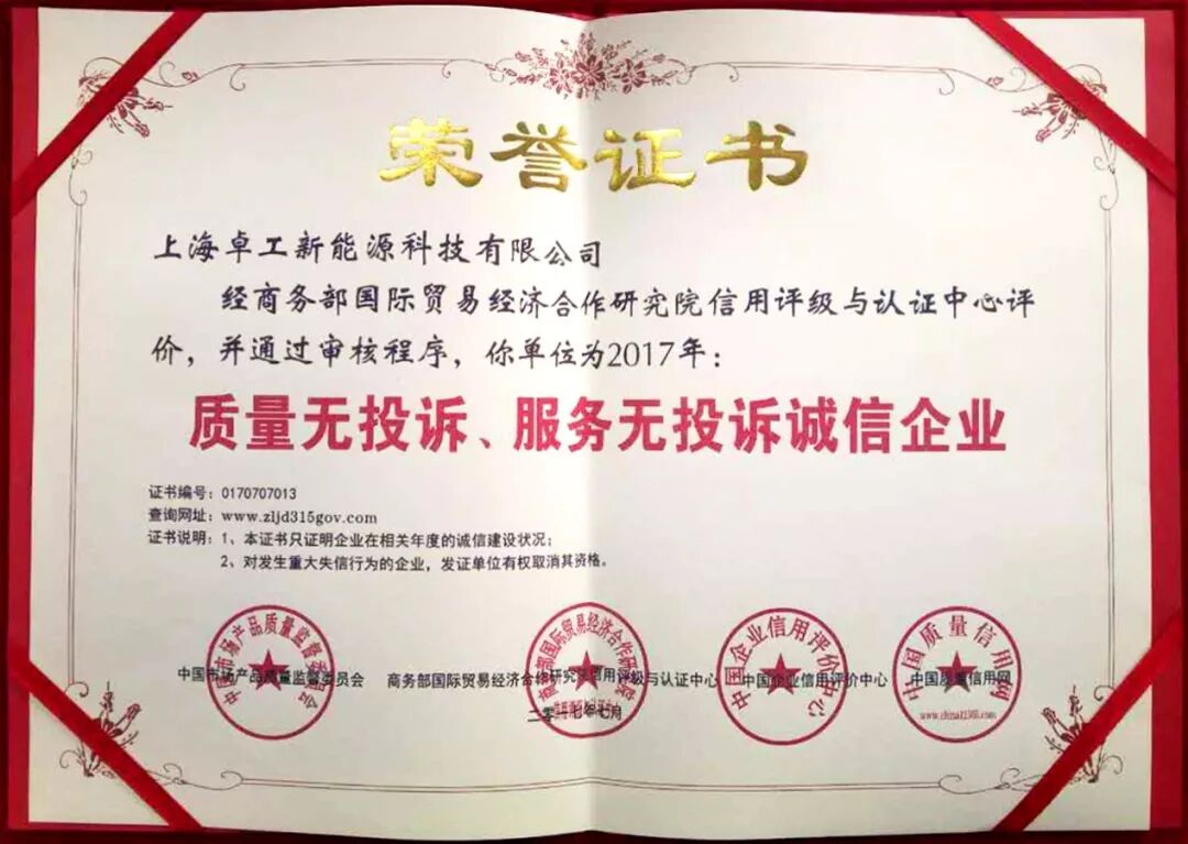 2017年,上海卓工新能源科技有限公司荣获“质量无投诉、服务无投诉诚信企业”称号