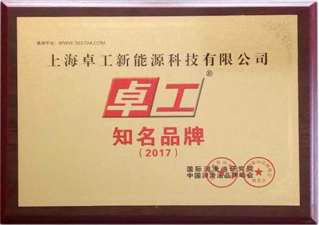2017年,上海卓工新能源科技有限公司荣获“国际润滑油研究院”和“中国润滑油品牌峰会”联合颁发的“知名品牌”称号
