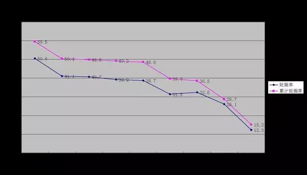 2、年龄与试管婴儿成功率的关系(某生殖中心2001~2006年试管婴儿与年龄相关性统计)