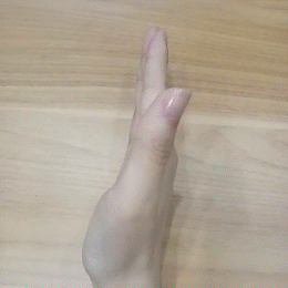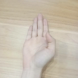 开始时手掌完全伸直。将拇指弯向手掌,保持此姿势数秒钟,将拇指伸直复位。然后将食指弯向手掌,保持数秒钟,然后伸直。用左手的每一根手指重复上述动作。双手交替进行。