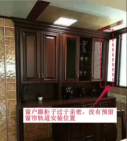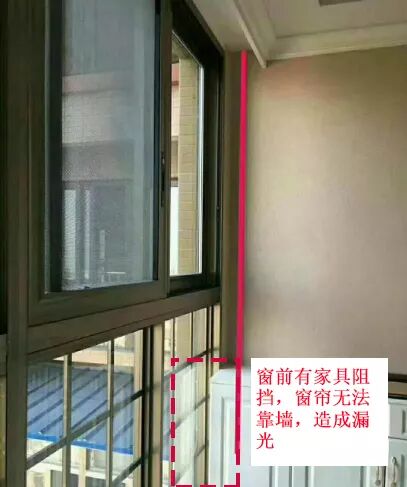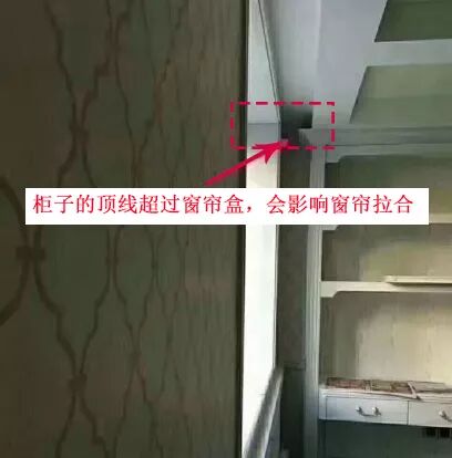 再譬如下图,虽然预留了窗帘轨道的安装空间,但是因为窗前有柜子阻挡,窗帘无法靠墙,则有部分窗户无法被窗帘遮盖,容易造成漏光,同时也影响窗帘美观。