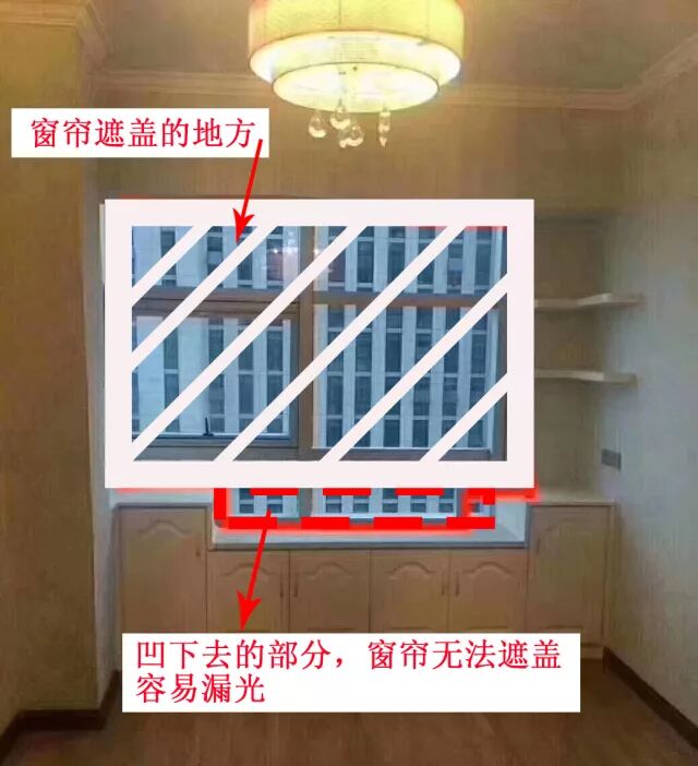 下图在窗边做了一个凹型储物柜,虽然充分利用每一寸空间,但是你有想过窗帘的感受吗?凹下去的部分,窗帘是无法遮盖的。