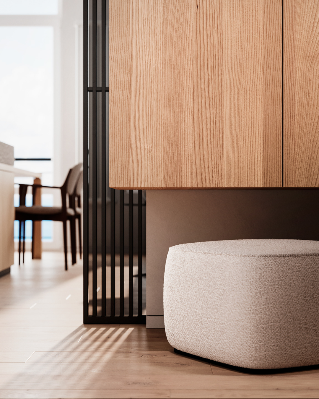 厨房延伸客厅装饰的风格采用了原木作为主色调,在保持一体性的同时,利用少许黑色装饰作为点缀,让阳光透过大面积的落地窗洒进室内,营造出温馨明亮的用餐氛围。