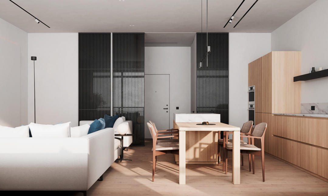 客厅主色调采用大面积的白色,地板则选用了浅色系的原木,让整体空间看起来舒心且柔和。