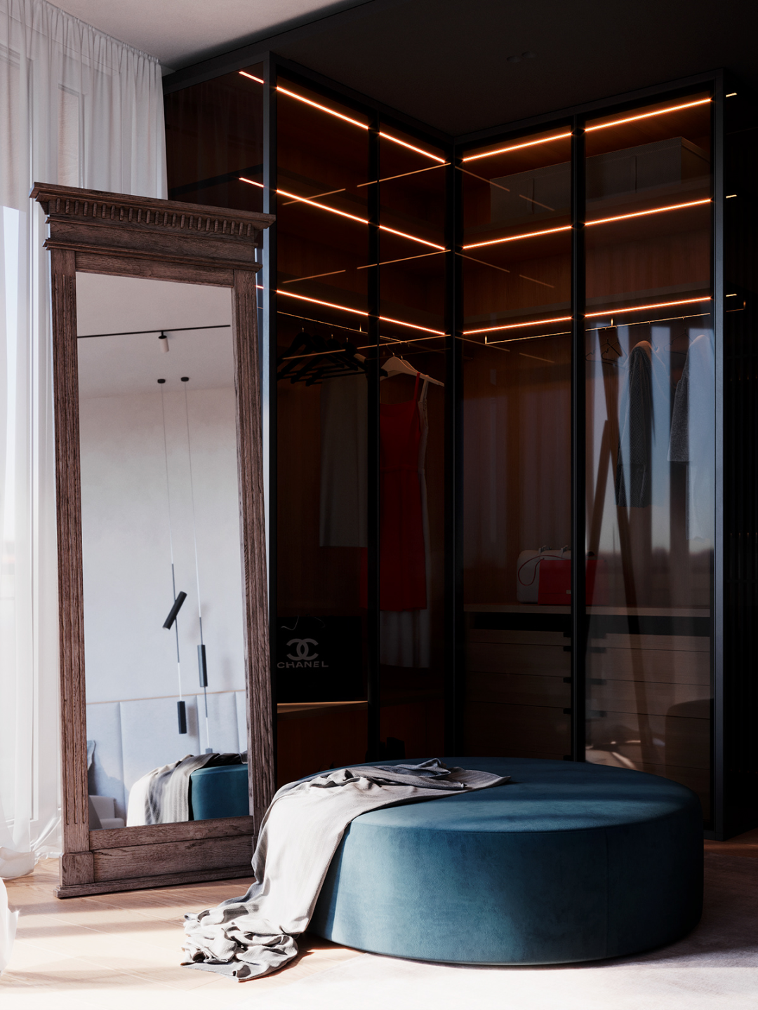 的衣帽间使用咖啡色玻璃隔断,有效地隐藏了橱子里的内容物,起到了很好的遮蔽性。