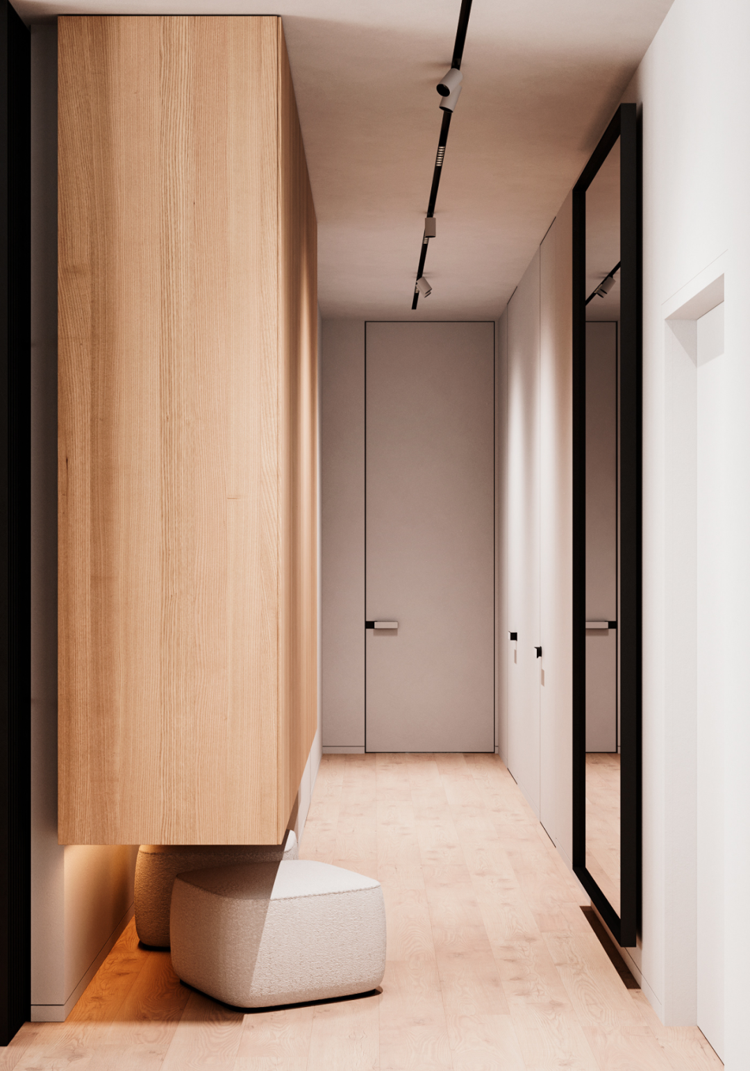 入口玄关处做了悬空的鞋柜,下面可以收纳换鞋凳,使用起来比较不占空间。