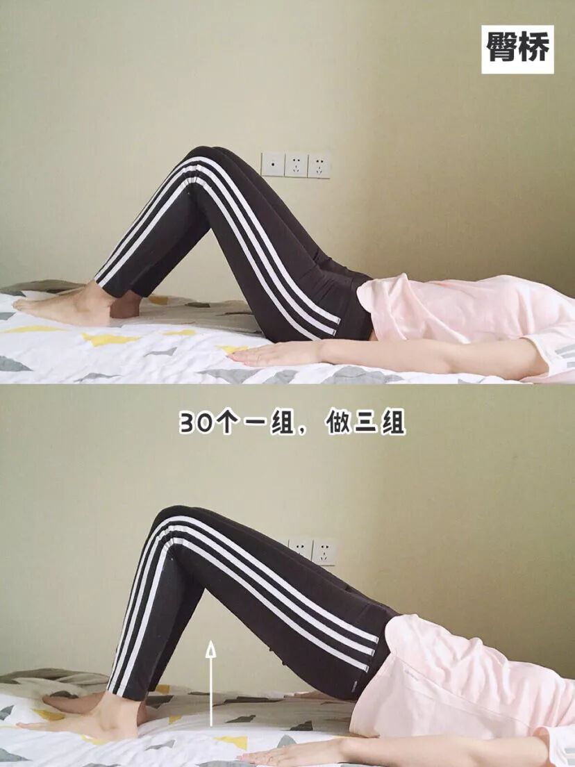 动作要领:身体平躺,双手放在身旁,双脚分开与肩齐平再将臀部缓慢抬到最高点停留3秒,再缓缓放下。