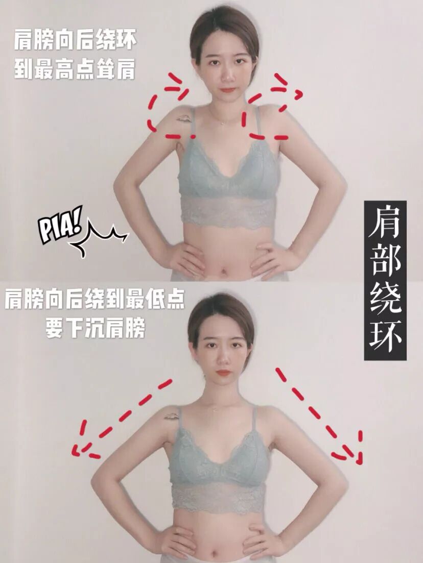 动作要领:双手叉腰,抬头挺胸。肩膀向后绕环。绕到最高点耸肩,向后绕到最低点时要下沉肩膀。