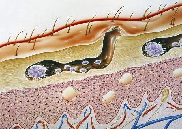 大量螨虫不分昼夜在皮肤上爬行以及尸体、虫卵等刺激毛孔变大和角质层增生,而使皮肤粗糙,而且螨虫排泄物、尸体堆积在毛孔内会撑大毛孔,甚至与皮脂混合氧化形成黑头。